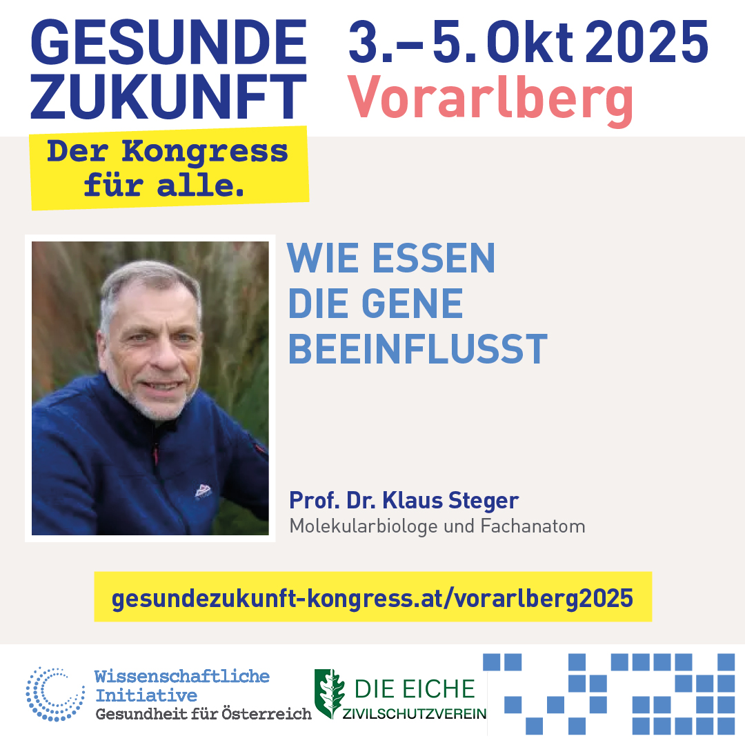 Prof. Dr. Klaus Steger, Molekularbiologe und Fachanatom. Seine Forschungen zur „(Epi)Genetischen Regulation der Genexpression in männlichen Keimzellen“ wurden durchgehend von der Deutschen Forschungsgemeinschaft (DFG) gefördert und resultierten in über 150 Originalpublikationen sowie zahlreichen Übersichtsartikeln und Lehrbuchkapiteln. Die Epigenetik ist für ihn der Beweis, dass wir keine Sklaven unserer Gene sind, sondern dass jeder mit einem gesunden Lebensstil aktiv zu seiner eigenen Gesundheit beitragen kann. Seit Eintritt in den (Un)Ruhestand ist er (Vorstands-)Mitglied bei MWGFD (Mediziner und Wissenschaftler für Gesundheit, Freiheit und Demokratie) mit den Schwerpunktthemen PCR- und modRNA-Technik.