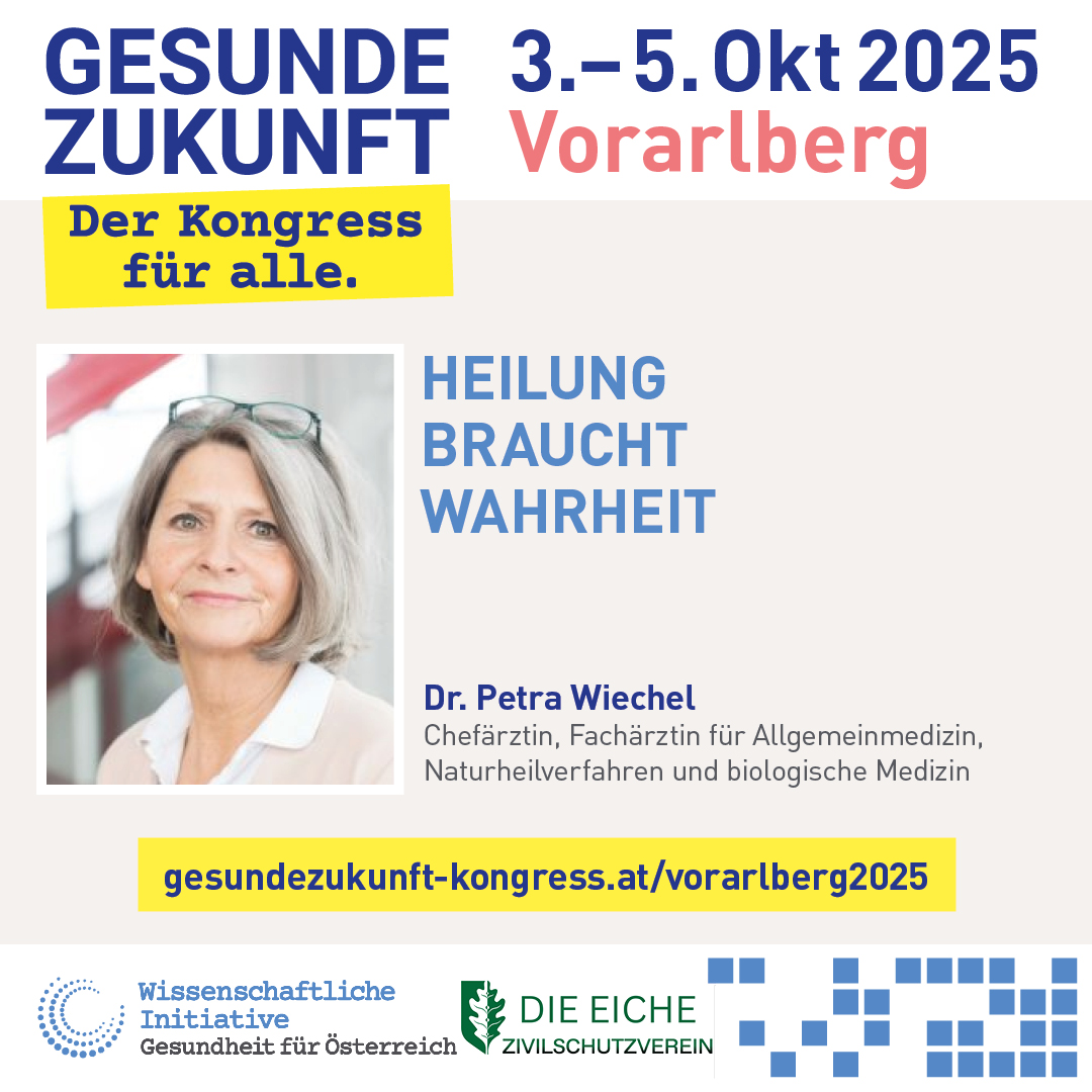 Als erfahrene Ärztin für biologische und integrative Medizin leitet Dr. Petra Wiechel die Swiss Mountain Clinic in Castaneda (CH), eine international renommierte Klinik für Ursachenmedizin und ganzheitliche Heilverfahren. Ihre medizinische Arbeit basiert auf der tiefen Überzeugung, dass echte Heilung nur dort geschehen kann, wo der Mensch in seiner Ganzheit – körperlich, emotional und geistig – gesehen und begleitet wird. In ihrem Vortrag „Heilung braucht Wahrheit®“ spricht sie über die Notwendigkeit innerer und äußerer Wahrhaftigkeit im Heilungsprozess – eine kraftvolle Einladung, den Mut zur eigenen Wahrheit zu finden und Gesundheit ganzheitlich neu zu denken.